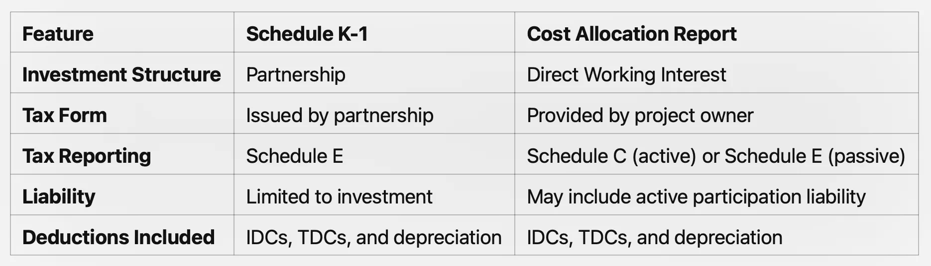 If your oil and gas investment is a direct working interest (not a partnership), you may receive a Cost Allocation Report instead of a K-1. This report provides a breakdown of the project’s expenses, including IDCs and TDCs, enabling you to claim these deductions directly.